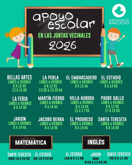 Acompañamiento escolar en 12 sedes vecinales en turnos de mañana y tarde. Apoyaturas en matemáticas e inglés.