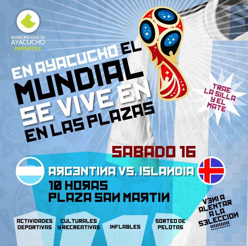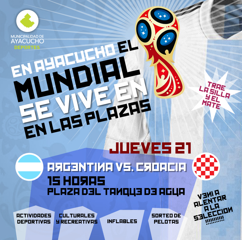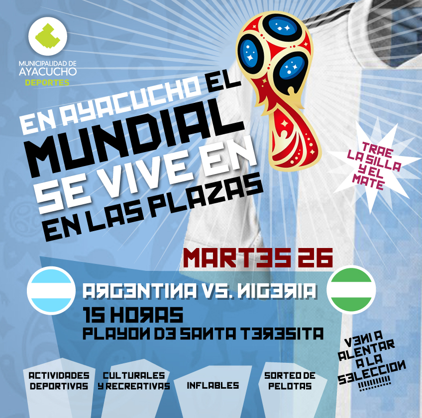En el marco del desarrollo de la Copa Mundial de Fútbol Rusia 2018, la Municipalidad de Ayacucho llevará adelante el programa MUNDIAL POR LAS PLAZAS, el cual consistirá en la proyección en pantalla gigante de los partidos en vivo y en directo de la selección Argentina. Además, habrá actividades deportivas culturales y recreativas, inflables y sorteo de pelotas en el entretiempo.