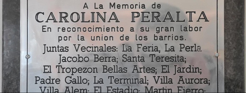 La placa reza lo siguiente: “A la memoria de Carolina Peralta. En reconocimiento a su gran labor por la unión de los barrios. Junta Vecinales: La Feria, La Perla, Jacobo Berra, Santa Teresita, El Tropezón, Bellas Artes, El Jardín, Padre Gallo, La Terminal, Villa Aurora, Villa Alem, El Estadio, Martín Fierro; El Embarcadero".