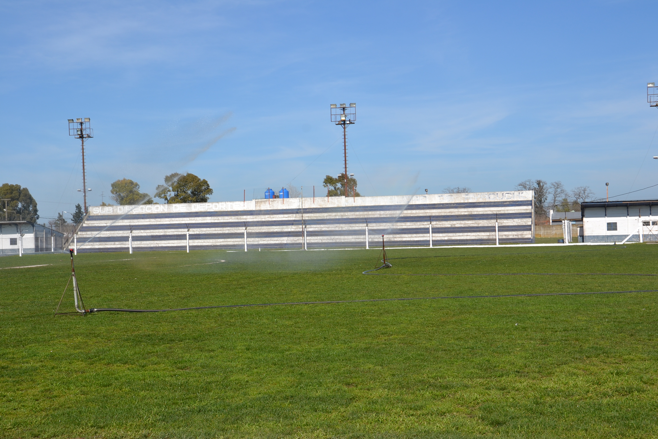 En el campo de juego las tareas también abarcan el paso de rodillo, el rastrillaje de las líneas y el regado para mantención del césped como corresponde.